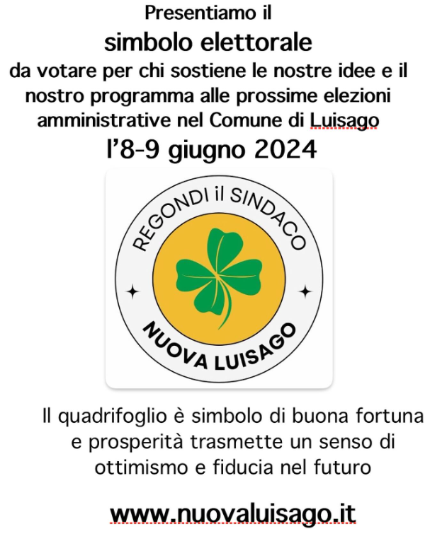 Nuova Luisago è lieta di presentare il proprio simbolo elettorale per le prossime elezioni amministrative del Comune di Luisago, che si terranno l’8 e il 9 giugno 2024. Il simbolo è un quadrifoglio verde su sfondo giallo, circondato dalle parole “Regondi il Sindaco” e “Nuova Luisago”.